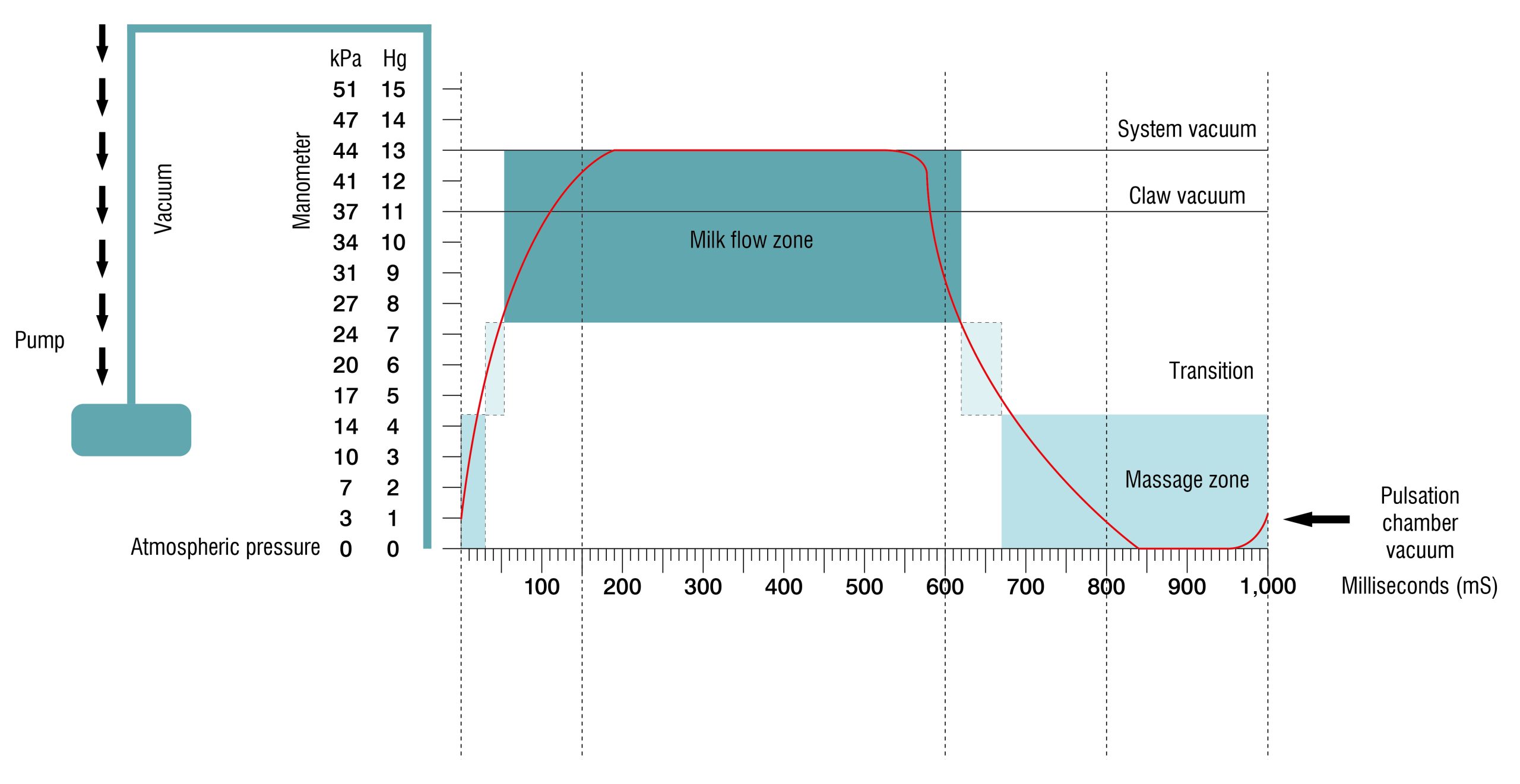 PHASE B: Die Offenphase des Melkliners. Das Vakuum wird auf die Zitze angewendet, um die Milch aus der Brust zu entfernen. In dieser Phase ist das Vakuum auf dem höchsten Niveau, um die Milch aus der Zitze zu entfernen.